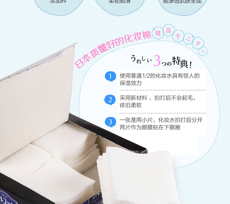 ●请不要用于化妆以外的用途。●不适合肌肤时,请停止使用。●本化妆棉用通常1/2量的化妆水就可以产生令人惊讶的润爽效果。●采用新开发的润滑海绵材料。●本化妆棉可以将化妆水完全送入肌肤,所以用通常1/2量的化妆水就可以从粉扑产生令人惊讶的润爽效果,能够用于轻拍皮肤、护肤。●极精细表面能够像黏在皮肤上一样贴紧肌肤,所以也推荐用于护肤。●而且配合了使肌肤触感变好的保湿成分。采用首创柔滑材料,能够呵护您的肌肤。【使用方法】●轻拍皮肤1.将大约通常一半量的化妆水在化妆棉表面展开。※注意不要使用过量化妆水。之后会溢出来。2.从与肌肤垂直方向轻柔地有节奏地轻拍皮肤使其渗入肌肤。●护肤轻拍皮肤后,以化妆水不足的地方为中心补充化妆水,沿打孔虚线将化妆棉一分为二,贴在担心的地方。※由于是2片1组,可以分开使用。进行揉搓会让化妆水更容易展开。※根据您的喜好,可以沿打孔虚线将化妆棉分开使用或一片一片地使用。