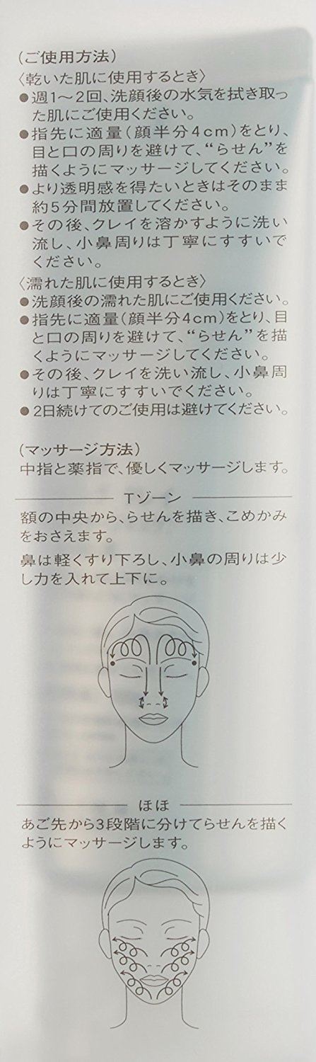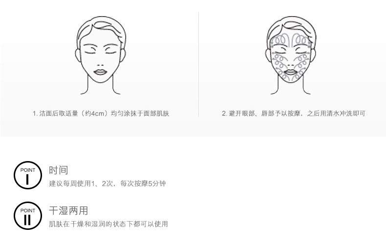 泥状按摩面膜, 清洁多余角质,吸附毛孔深层污垢。 使用方法:洁面后取适量均匀涂抹于面部肌肤予以按摩。(避开眼部,唇部)按摩后,使用清水洗净即可。肌肤干湿状态均可使用,在干燥肌肤上敷5分钟效果更佳。