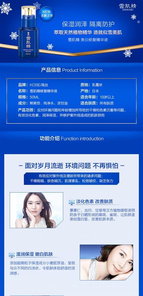产品描述高丝雪肌精美白防护精华液50ml全面保护肌肤避免受到紫外线对肌肤所造成的各种侵害,保持肌肤白皙且洋溢着透明美感的日间用美白美容液。 防止黑斑和色斑的生成,以水润的使用感迅速地融合于肌肤,令肌肤白皙明丽。 含薏苡仁、当归、白蔹、旋覆花、牡丹皮等多种汉方植物提取液,特别值得骄傲的是—采用了具有卓越美白效果并且在雪肌精系列中初次登场的金银花提取液。具有优越的妆前隔离效果,添加水油分平衡均衡聚合物与多孔质粉粒,能在肌肤表面形成均一的化妆薄膜,因此也可以作为化妆基底或防晒品使用。